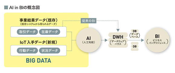 企業システムが生成するデータとIoTデータは、必ずしも同じ場所に格納される必要はない。それらを仮想的に統合し、AIで分析してBIの機能を用いてビジュアライズする。これが「AI in BI」の考え方である。