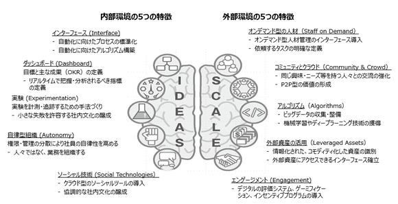 私たちは、このような設立後6年間に最も急速に成長した世界中のスタートアップ100社を調査し、共通する特徴を分析しました。その結果、それらの企業には、私たちが「MTP(Massive Transformative Purpose)」と名付けた野心的な変革目標と、内部・外部環境各5個の特徴という共通項があることを発見しました。飛躍型企業はこうした特徴を生かし、指数関数的な成長を遂げています。外部環境の5つの特徴を表す略語が「SCALE」、同じく内部環境の略語は「IDEAS」です。