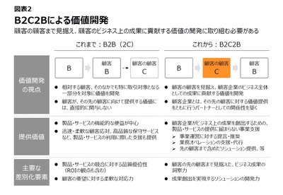 顧客企業のビジネス成果の創出に貢献するためには、顧客企業のビジネスをより深く理解する必要がある。そのために必要な視点が、”B2C2B”である。顧客企業を理解するためには、その先にいる顧客の顧客が何を求めているか正しく把握することが求められる。企業は顧客企業との間にパートナーとしての新たな関係性を築き、ともにその先の顧客に対して価値を提供することが求められている。顧客との新たな関係性の構築に向けては、製品・サービスの機能的な便益だけでなく、顧客企業の事業運営に対する全体的な支援の提供がカギとなる。顧客企業のビジネス上の成果を見極める洞察力と顧客の顧客の利益まで見据えたソリューションの開発力がその実現を下支えする。