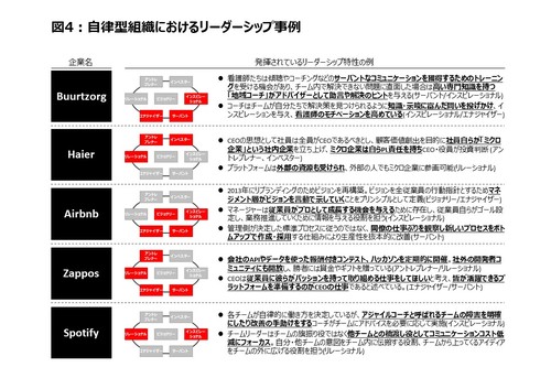 そのほかの自律型チームを抱えている企業に目を向けても、7つのリーダーシップのいくつかを複数の個人が有機的、ダイナミックに発揮しているものと見受けられる(図4)。