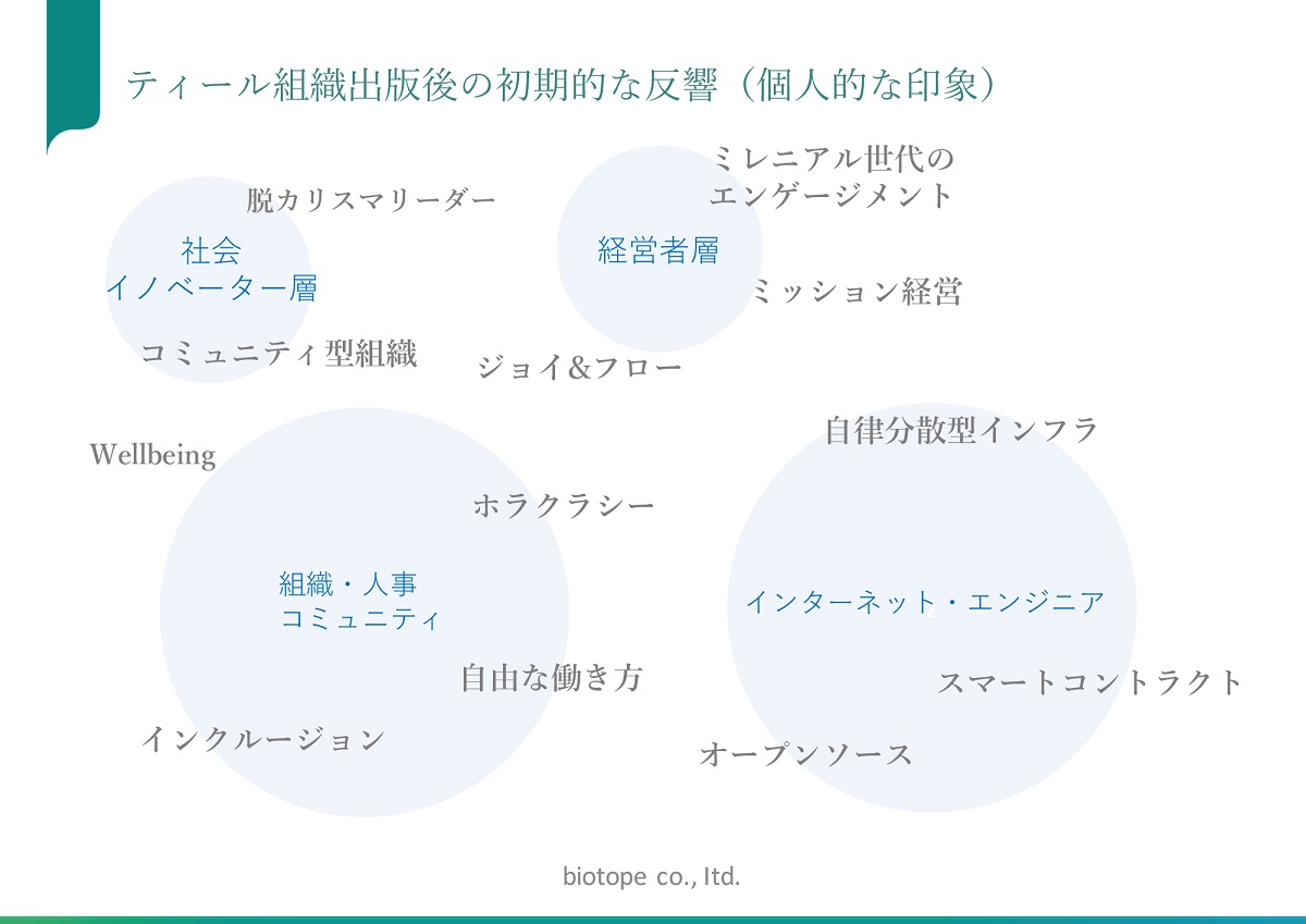 佐宗:あくまで個人的な印象ですが、大きく分けて4つのクラスターの方々がアーリーアダプターとして反応したように感じています。社会イノベーター、経営者、組織・人事コミュニティ、ITエンジニアの4つです。興味深いのは、それぞれの層によって興味を持っているキーワードが異なることが、この本で提唱されている思想の適用範囲の広さを表していると思います。