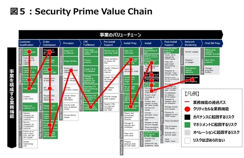 したがって、根拠なく個別業務のなかにディープダイブした業務フローを描くような行いではなく、図のように自社のビジネスを俯瞰したマップと、リスクシナリオを結びつけセキュリティ視点の脆弱性を色づけするアプローチを取る。赤い線はある事業におけるクリティカルな業務機能のつながりを示しており、そのなかでどの箇所にリスクシナリオが存在するのかを可視化していく。