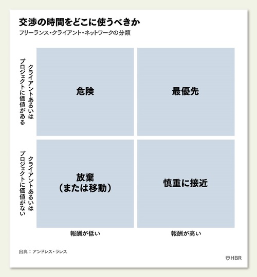 大切にしたくなる人間関係だと思えるし、相手の言葉もそう匂わせるため、フリーランサーはそうすることを正当化する。だが、この不健全な交渉には、警戒を怠らないことが大切だ。ある程度の距離を置き、必要であれば、報酬を受けられるようになるまで、そのクライアントを左下に移動させよう。