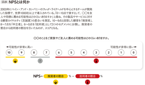 もともと、顧客の経済的価値と結び付ける形で顧客ロイヤルティの向上に取り組むアプローチは、2000年代に米国を中心として広まったものである。日本でも金融、通信、流通、サービス業を中心に浸透し、ベインの開発した顧客ロイヤルティを測るNPS(ネット・プロモーター・スコア[注1])などの指標を活用する企業も増加している(図表「NPSとは何か」を参照)。ますます多くの企業が、顧客ロイヤルティを高めることで自社の収益成長を加速できると考え、取り組みを活発化させているのだ。