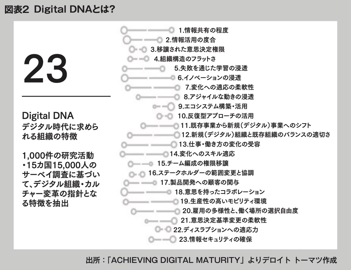 では、デジタル組織にふさわしいカルチャーとは具体的にどのようなものだろうか。それは「デジタルマチュリティ(成熟度)の高い企業」のカルチャーに学ぶのが近道だ。デロイトでは、2017年にマサチューセッツ工科大学(MIT)、Facebookと共同でデジタル先進企業を国際的に調査した。この調査から抽出したのが、図表2に示した23の特徴である。デロイトではこれを、ヒトゲノムの23種類の染色体になぞらえて「Digital DNA」と呼んでいる。