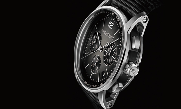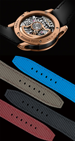 新作の特徴は、ブラックセラミックによる8角形のミドルケース、ケースのサテンブラッシュ仕上げに合わせて縦方向のヘアライン仕上げを施したスモークグレーのラッカーダイヤル、そしてテキスタイルモチーフを表面に施したラバー加工ストラップ