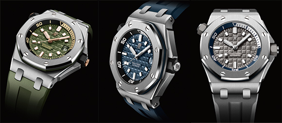 「ダイバー」のダイヤルは、以前のプリントによる"Audemars Piguet"のロゴが「CODE 11.59」で用いられた3D成形によるゴールドの"AP"に変わり、従来の細いバーインデックスは6・9・12時を強調したブロックに置き換えられて視認性が高まっている。また「CODE 11.59」の開発から派出した技術は、この「ダイバー」に搭載されたムーブメントにも生かされており、自社製ムーブメントは、振動数が2万8800/時へと向上した最新の自動巻きである。