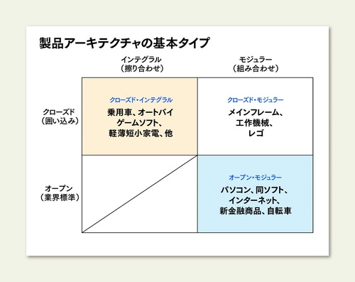 入山:藤本先生の考えで特にインパクトがあるのが、2000年ごろに発表された「製品や生産設備にはそれぞれ<アーキテクチャ>、つまり設計思想が存在する」という考え方です。これはアカデミアでは大変有名ですし、日本中のものづくりに関わっている実務家の多くが知っています。ただ、改めてそれは何かとごく端的に言えば、どのような製品も、(1)部品などの構造と機能が複雑に絡み合った、最適設計を要する「インテグラル(擦りあわせ)型」と、(2)構造と機能が一対一でシンプルに対応し、設計調整を節約できる「モジュラー(組み合わせ)型」を両端としたどこかに位置付けられる、というものだと理解しています。
