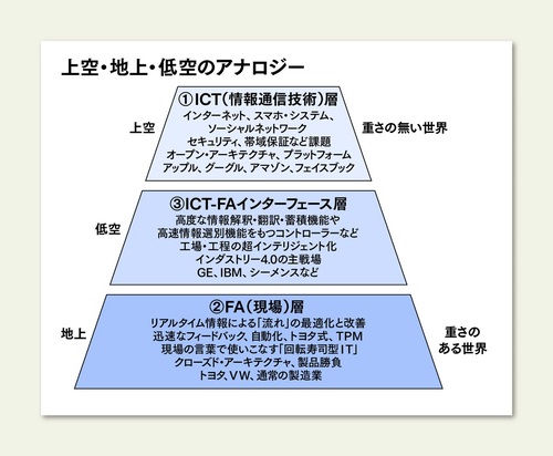 すなわち、(1)「プラットフォーム盟主企業」が牛耳っている、ICTやデジタル財の「上空」、(2)重さのあるものを設計・開発する、FA(ものづくりの現場)の「地上」。そして(3)2010年代に出現した、両者をつなぐインターフェイス層の「低空」です。