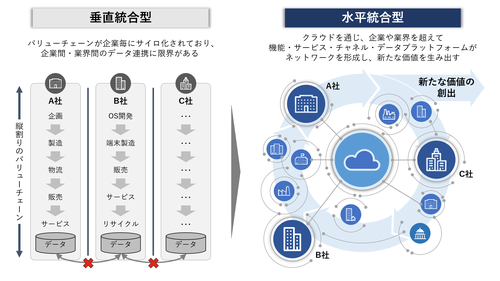 水平統合型は、Society 5.0のベースにある考え方。クラウドの持っているアジリティ、接続容易性を生かしながら、企業間、業界間をつないでいく。垂直統合型から水平統合型への変革は、システムだけではなく、ビジネスモデルに対する要請でもある。