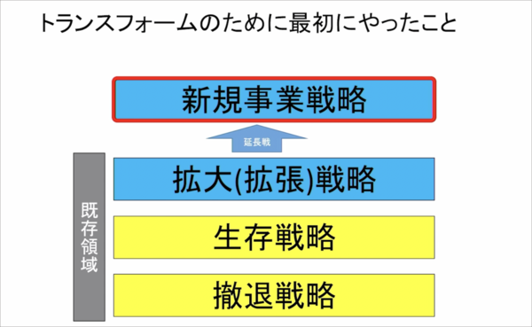 業容のトランスフォームのため、リクルートが最初に実行したのは「事業戦略の見直し」だ。具体的には既存領域を「拡大(拡張)戦略」「生存戦略」「撤退戦略」の各領域に分類し、拡大(拡張)戦略は「新規事業戦略」へと発展させた。