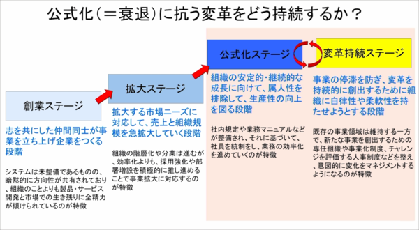 「リクルート創業から60年。当社は『創業ステージ』から『拡大ステージ』へと、ステップアップしてきました。次に達すべきステージは、組織の安定性・継続的な成長に向けて属人性を排除し、生産性の向上を図る『公式化ステージ』です。このステージでは一定程度まで成長するものの、その後、苦しくなる確率が極めて高くなります。それに抗うには、『変革持続ステージ』も必要です。具体的には、事業の停滞を防ぎ、変革を持続的に創出するため、組織に自律性・柔軟性を持たせようとする段階です。公式化ステージと変革持続ステージの両輪で回していくことが、プロジェクト型経営では大切です。同時に、環境変化速度に合わせた組織の許容度の調整が欠かせません。環境の変化速度が遅い市場・時代に組織の許容度を高めると無駄が生まれますが、反対に環境の変化速度が速い市場・時代に組織の許容度を低くすると、その企業は衰退しやすくなります。環境変化と組織の許容度のバランスを取っていくことが、プロジェクト型経営には肝要なのです」