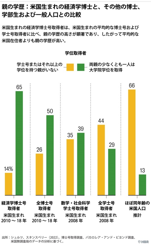 この点において、格差はよりいっそう際立っている。近年の米国生まれの経済学博士は、ほぼ同年齢の平均的な米国人と比べて、親が大学院の学位を持つ割合が約5倍だ。大卒の親がいない家庭の出身である割合は、わずか5分の1である。