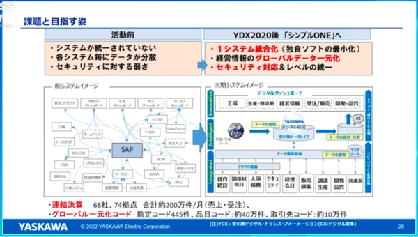 「YDXに取り組む以前から、当社はすでにERP(SAP)導入などを進めていました。しかし、システムが統一されていないなどいくつかの課題が顕在化。とりわけ経営・業務の中心にデータを据えた『安川版データレイク』構想はわれわれの念願でした。当社が推進するデジタル経営においては、名寄せも含めて勘定科目・品目コード・取引先コードをグローバルで統一しています。連結決算で交わされる売上げ・受注などのデータはグループ68社74拠点(海外事業含む)で月200万件に上りますが、これらはすべてグローバル一元化コードにより統合・管理されています」(小笠原氏)