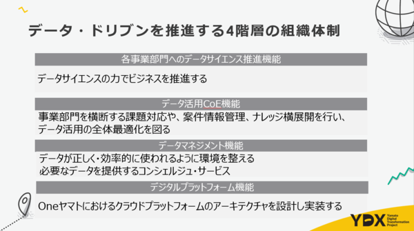 そしてデータ・ドリブン経営を推進する4階層の組織体制を構築しました。まずは1階層部分でデータ基盤の構築を行い、その上層の2階層部分では散在しがちであるデータが正しく使われるようにデータマネジメントの機能を持たせています。さらに、3階層部分では、CoE(Center of Exellence)チームが全社横断的なデータ活用の支援や推進を担っています。最上層では、事業部門ごとにデータサイエンティストを配置し、ビジネスの課題解決を推進しています」(中林氏)