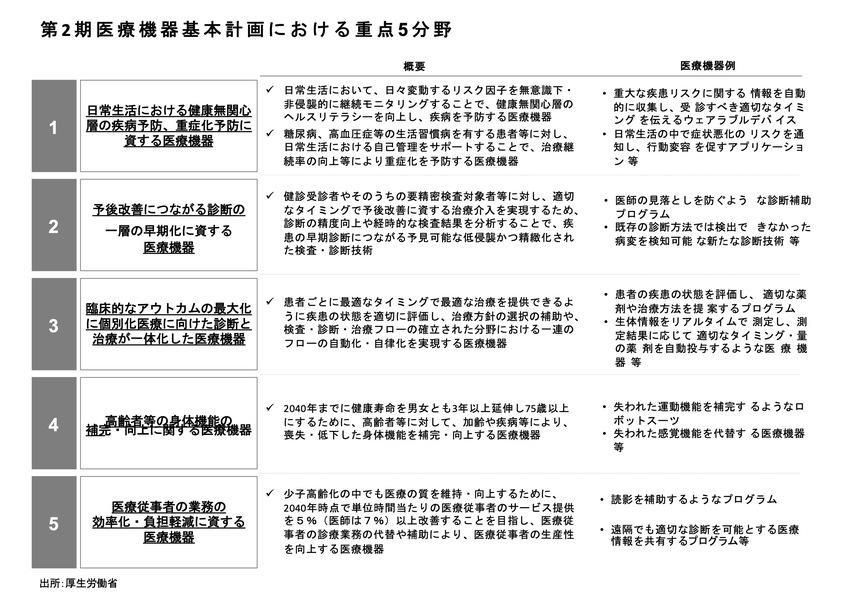 それに対して第2期では、患者や医療現場の「ニーズ起点」で重点5分野を決め、具体例も挙げました。重点5分野は、「健康無関心層の疾病予防、重症化予防に資する医療機器」「予後改善につながる診断の一層の早期化に資する医療機器」などですが、いずれの分野でも具体例にSaMDが含まれています。